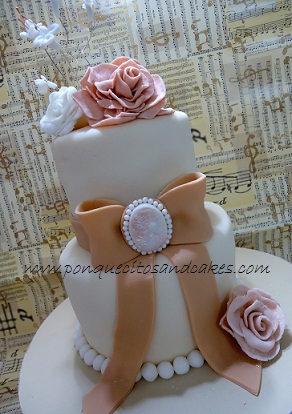 Esta tarta con bellos y elegantes tonos muy acordes con el vestido de la novia, lleva en su diseño la añoranza de lo vintage, con su gran lazo y su camafeo. El diseño se realizo bastante alto para que tuviera ese aire elegante y en su interior hay un esponjoso bizcocho de vainilla relleno con ganache de chocolate.